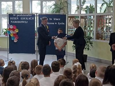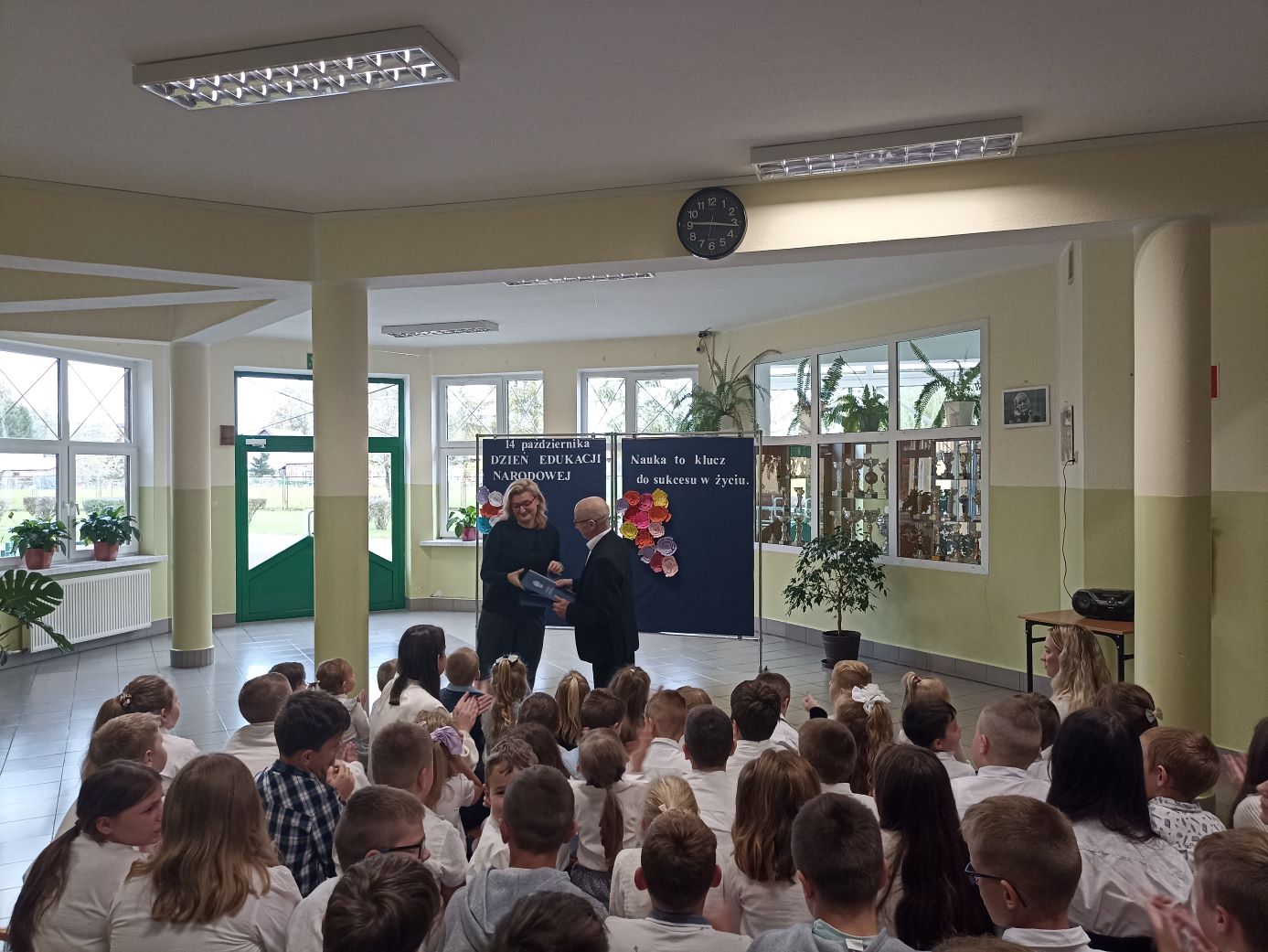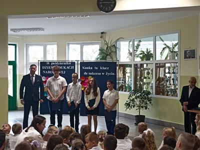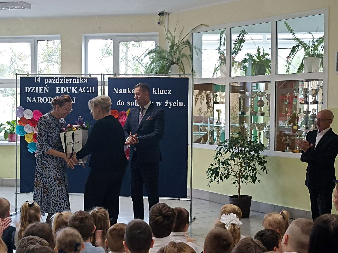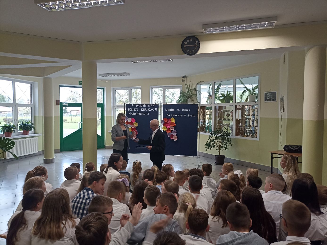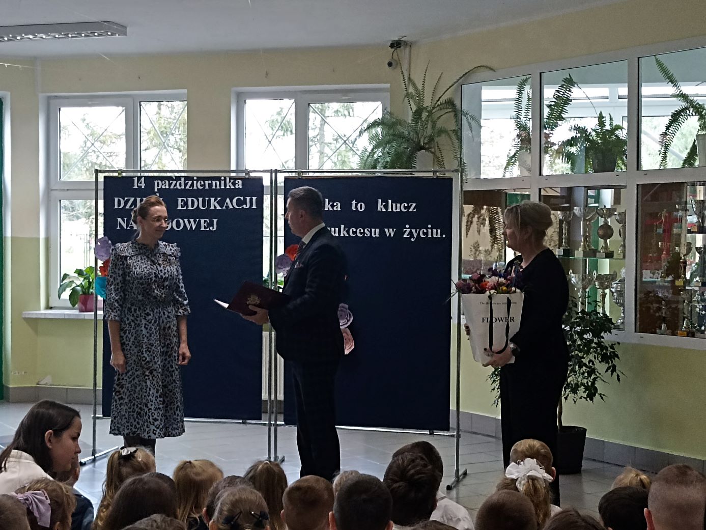 15 października w naszej szkole odbyła się uroczysta akademia z okazji Dnia Edukacji Narodowej. To wyjątkowe święto jest okazją, by wyrazić wdzięczność wszystkim nauczycielom i pracownikom oświaty za ich trud, zaangażowanie i codzienną pracę na rzecz uczniów. W uroczystości uczestniczyli zaproszeni goście: zastępca wójta, sekretarz gminy, przedstawiciele Rady Rodziców, grono pedagogiczne oraz cała społeczność szkolna. W swoich wystąpieniach goście podkreślali znaczenie edukacji, dziękowali nauczycielom za ich poświęcenie i serce wkładane w kształtowanie młodych pokoleń, a także życzyli dalszych sukcesów i satysfakcji z pracy.