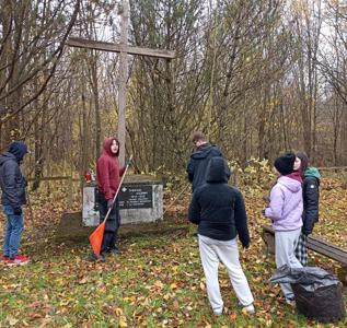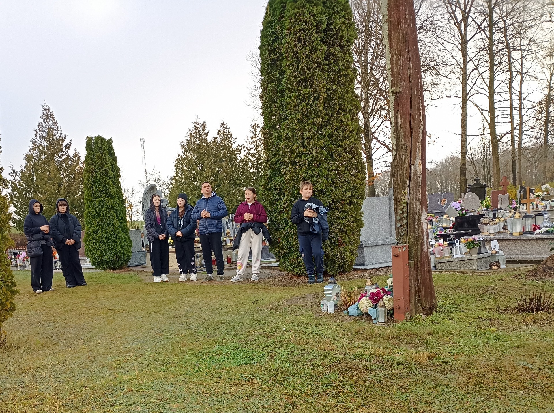 W piątek 30.10.2025r. uczniowie klasy VIII pod opieką nauczyciela udali się na pobliski cmentarz celem uczczenia pamięci zmarłych żołnierzy. Odwiedzili groby żołnierzy poległych w czasie I wojny światowej. Spacer na cmentarz wprowadził uczniów w nastrój refleksji, zadumy oraz wspomnień o osobach bliskich, których już niestety z nami nie ma. Przy grobach uczniowie słuchali opowieści nauczyciela na temat żołnierzy spoczywających w mogiłach, wspólnie modlili się, zapalili znicze oraz zagrabili liście. Była to ważna lekcja wychowania rodzinnego, obywatelskiego i patriotycznego.