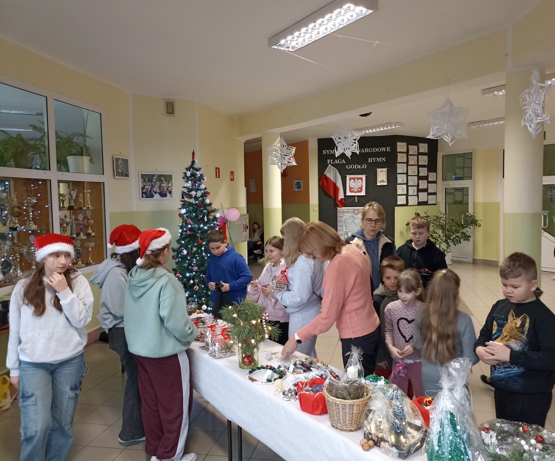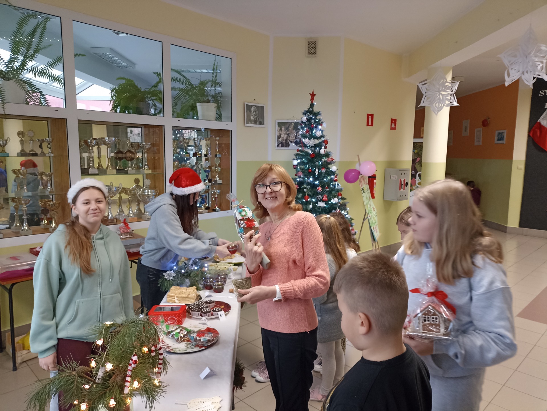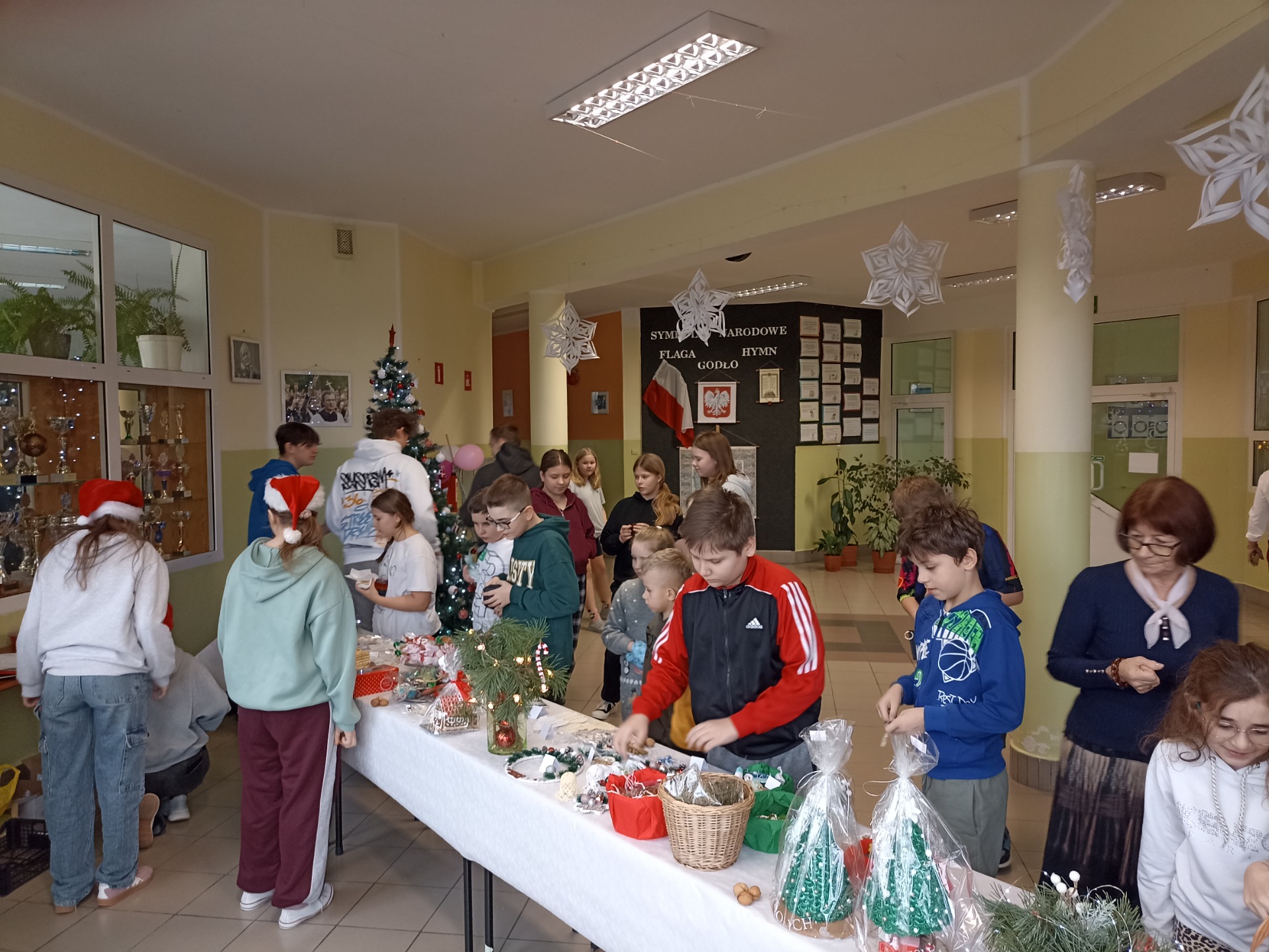 W dniu 15-16.12.2025r. w naszej szkole odbył się kiermasz bożonarodzeniowy, który wprowadził całą społeczność szkolną w wyjątkowy świąteczny nastrój. Na stoiskach można było znaleźć własnoręcznie wykonane ozdoby, stroiki oraz domowe wypieki. Wydarzeniu towarzyszyła serdeczna atmosfera, uśmiechy i wspólne rozmowy, kiermasz cieszył się dużym zainteresowaniem uczniów, rodziców i nauczycieli. Serdecznie dziękujemy Rodzicom za ogromne zaangażowanie, przygotowanie pysznych wypieków, a także za poświęcony czas i wsparcie organizacyjne. Wyrazy wdzięczności kierujemy również do Nauczycieli i Pracowników szkoły za koordynację wydarzenia, pomoc w przygotowaniach oraz czuwanie nad jego sprawnym przebiegiem. Dzięki Państwa współpracy kiermasz okazał się dużym sukcesem i wspaniałym przykładem szkolnej wspólnoty.